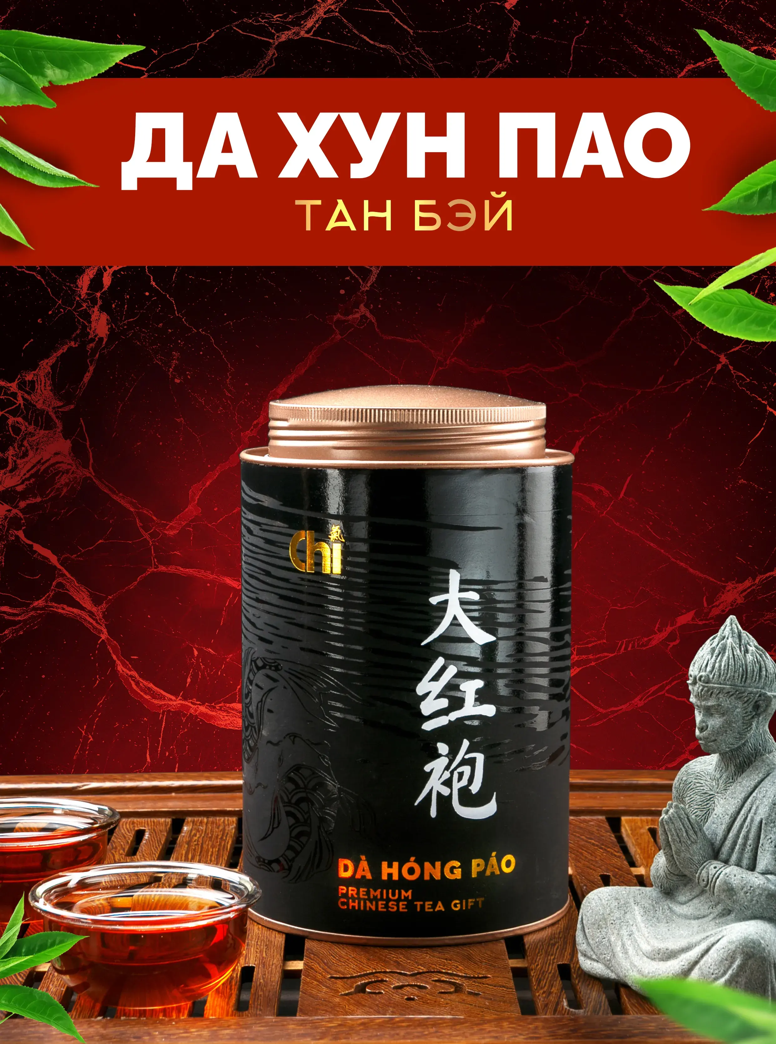Упаковка: чёрная металлическая банка с золотой крышкой, иероглифами 大红袍 и брендом CHI, деревянная ложка в комплекте