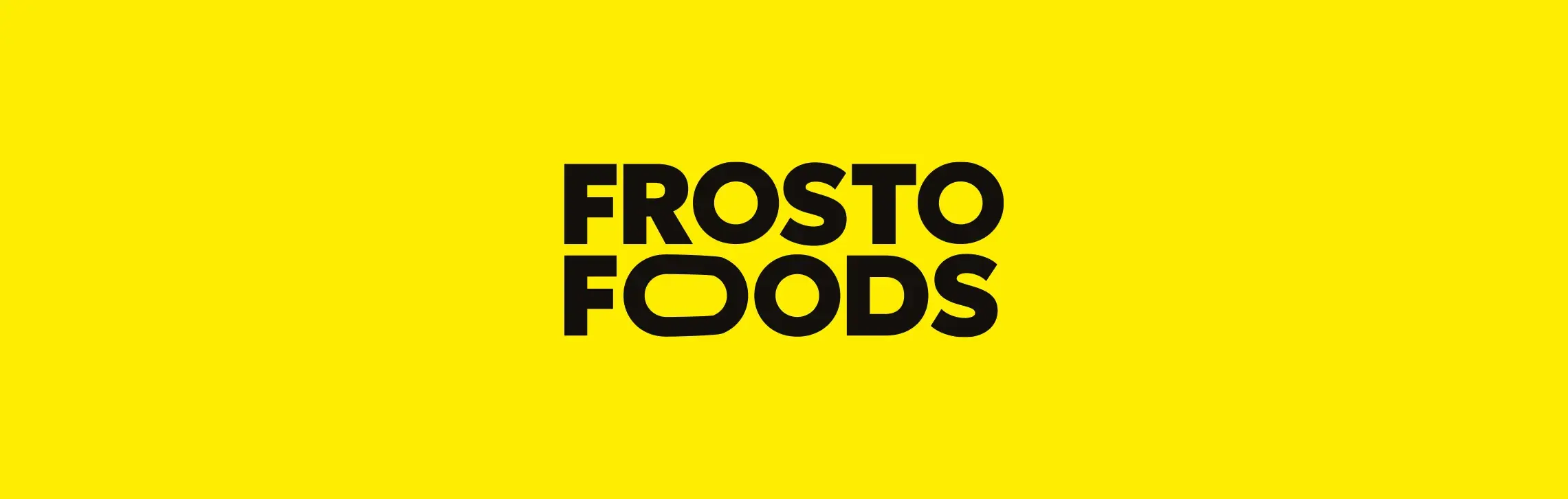 Логотип «Frosto Foods» в рубленом шрифте с наклоном передаёт динамику и свежесть
