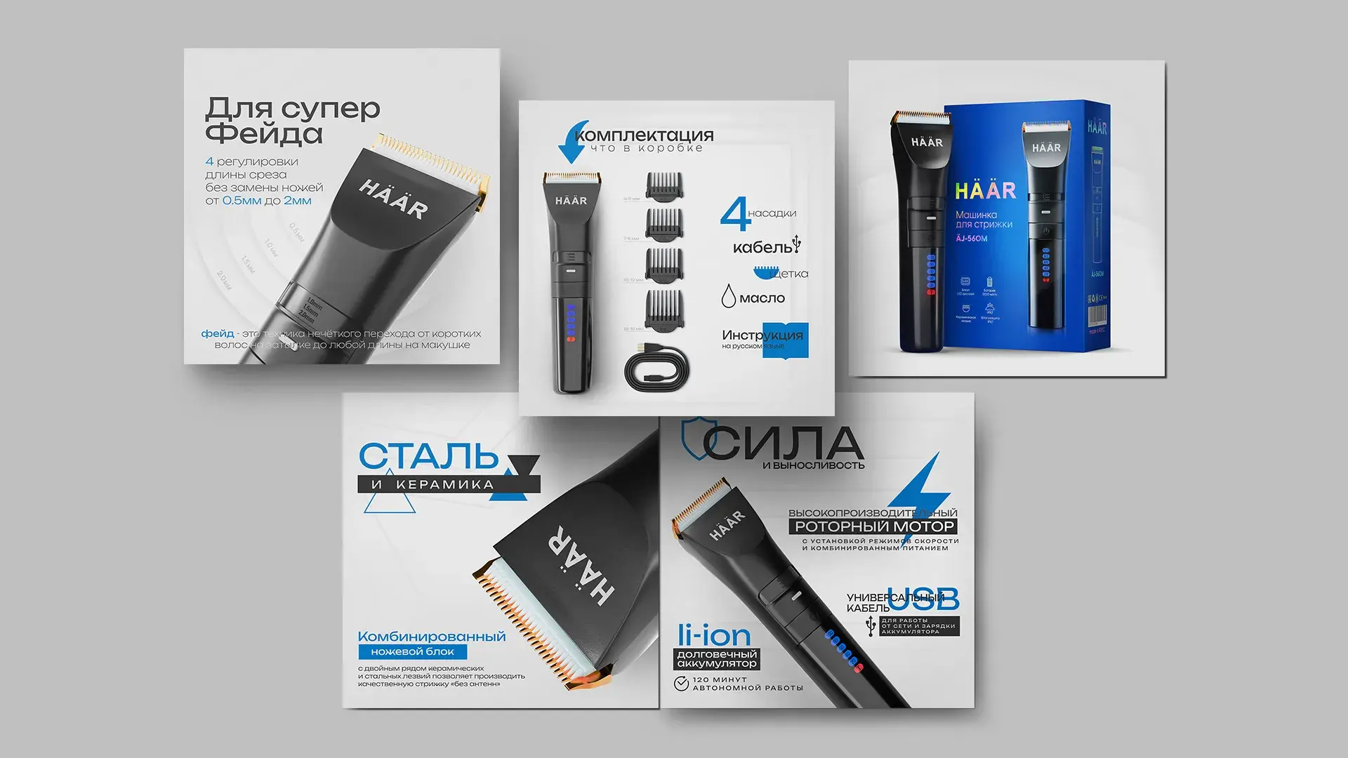 Серия упаковки HÄÄR успешно подчеркнула премиальность бренда и технические преимущества моделей. Инфографика с размерами насадок и акцентами на автономность и функции облегчила выбор для покупателей, а визуальные решения — синие тона и золотой логотип — сделали продукты заметными на полках и в маркетплейсах. В первый месяц после запуска упаковки продажи выросли на 42%, а отзывы клиентов выделяли удобство комплектации, автономность и эргономику машинок.