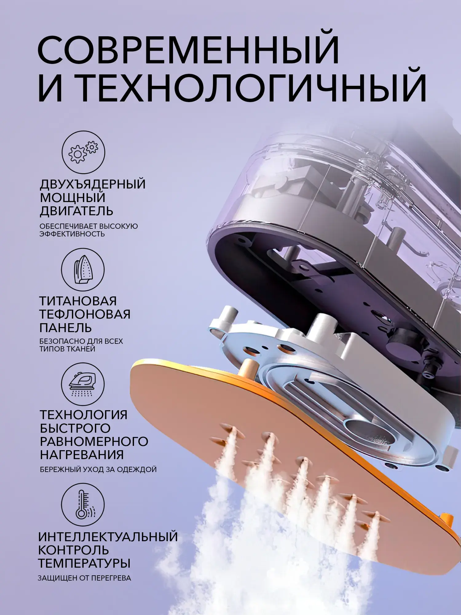 • Главное фото: отпариватель с электронным дисплеем и текст «Самый мощный 3 в 1».