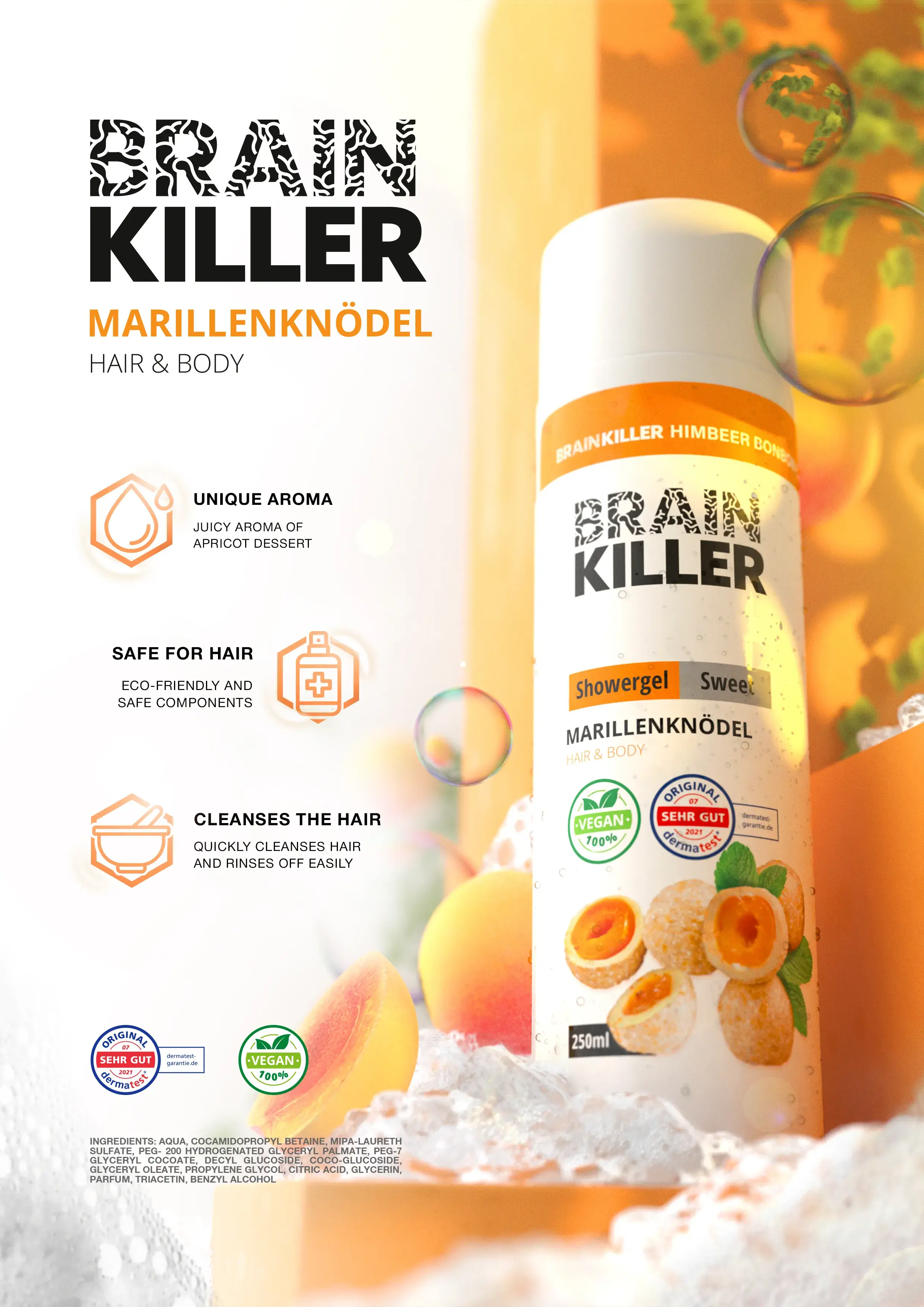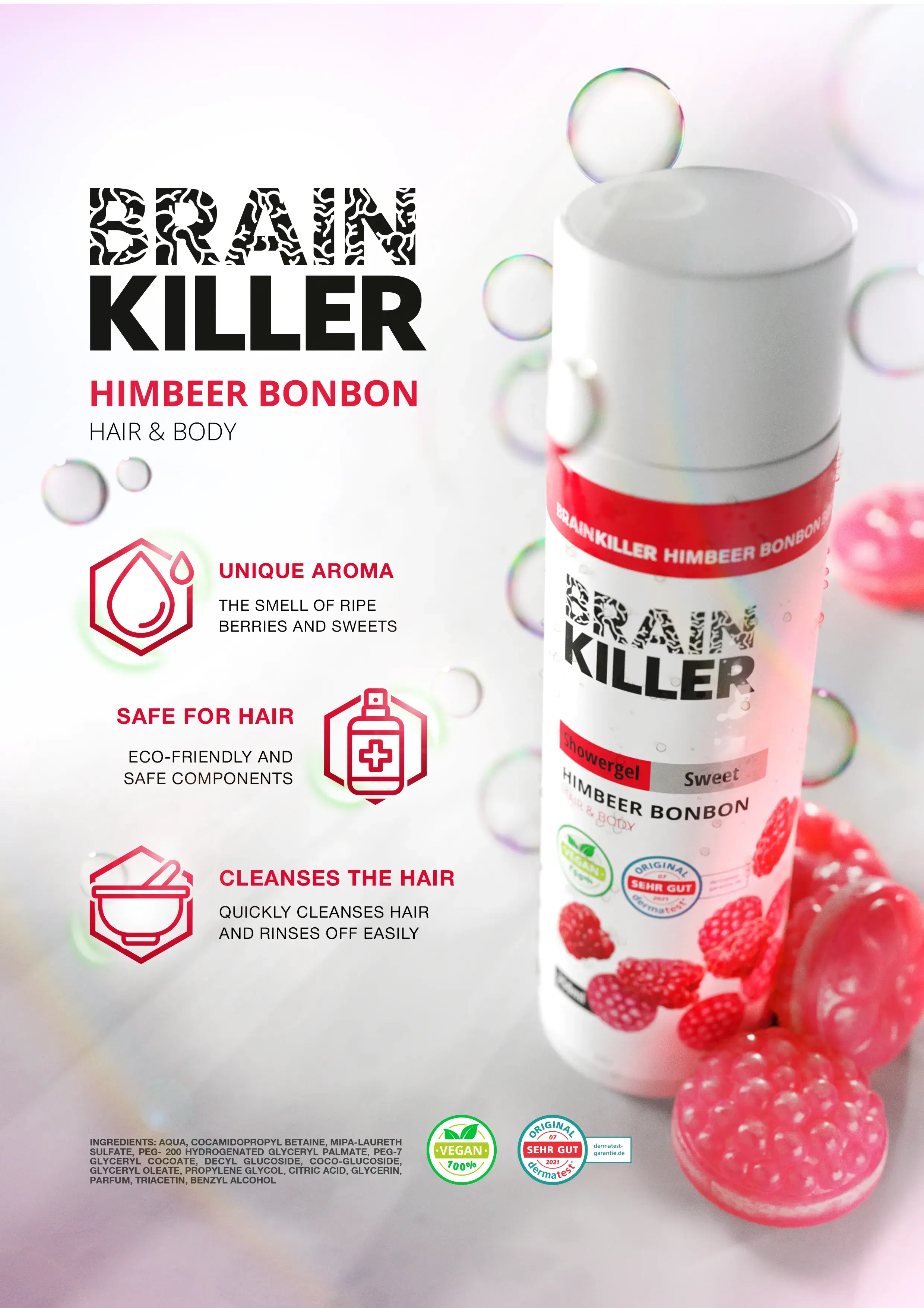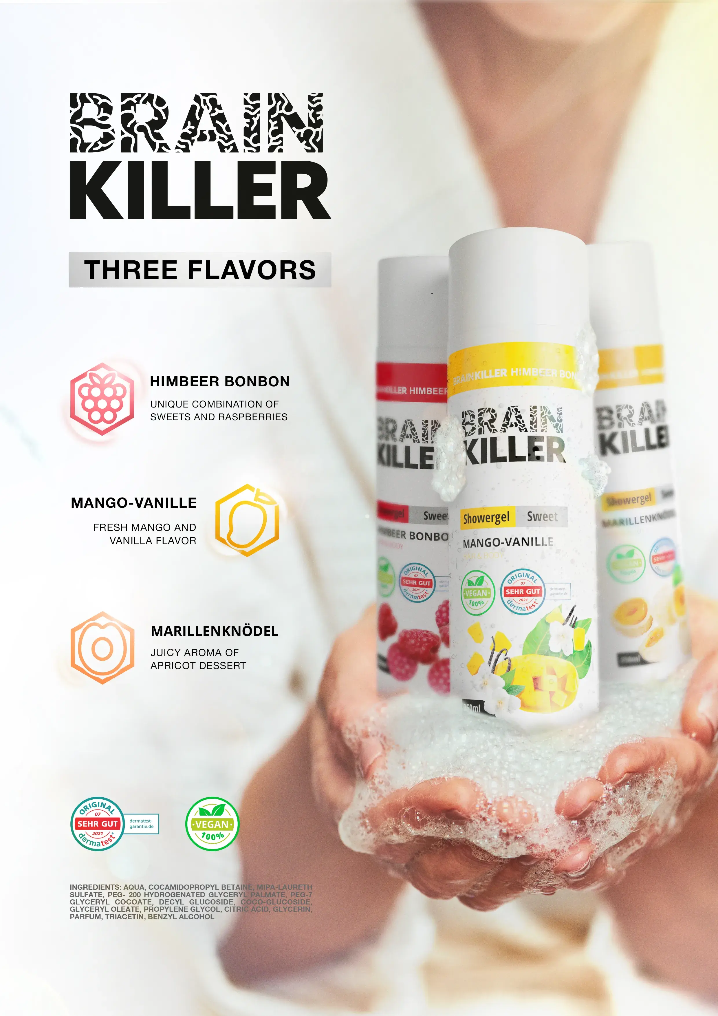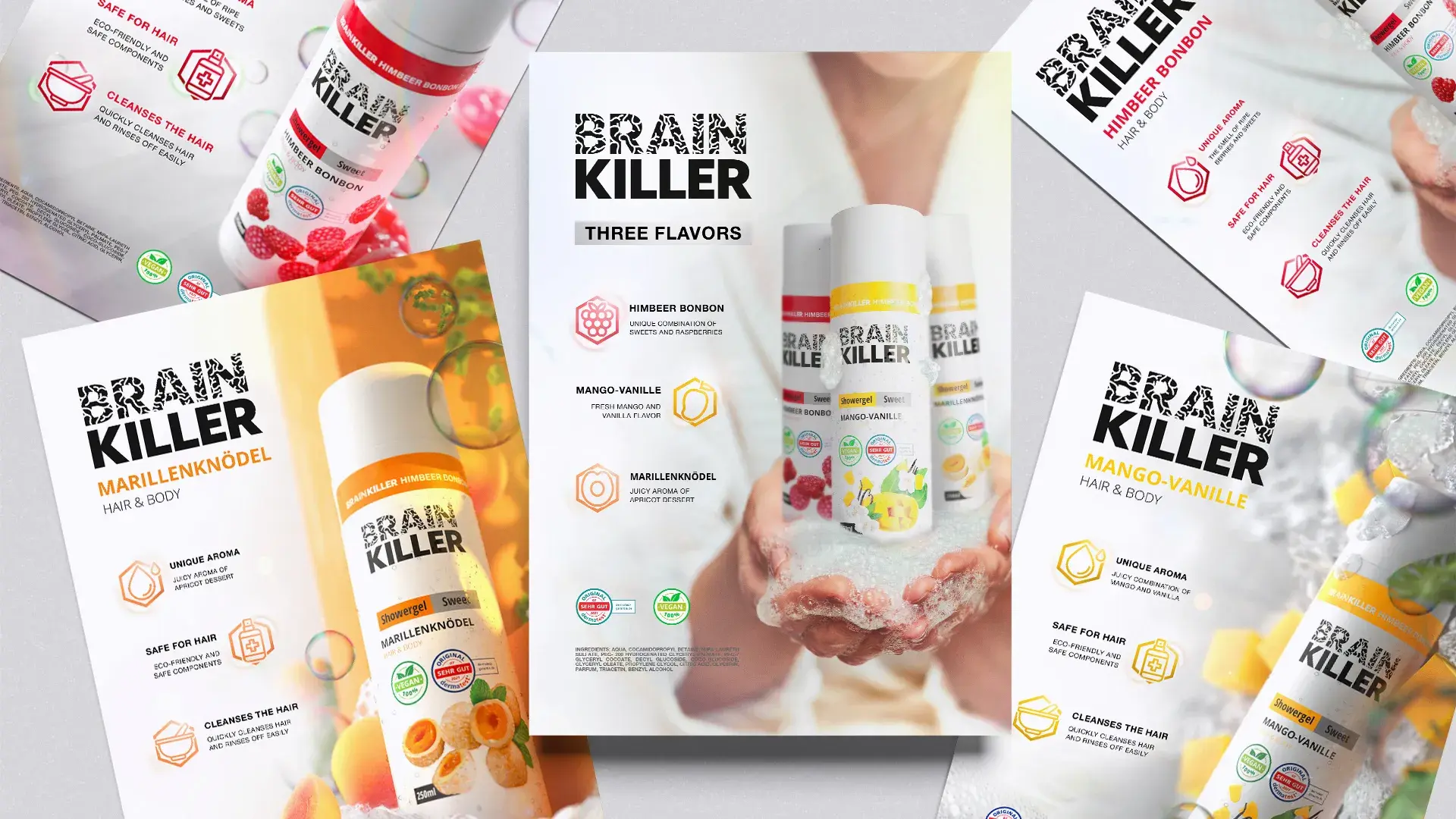 Дизайн упаковки и карточек для маркетплейсов бренда шампуня и геля для душа Brain Killer — яркий, экологичный образ с тремя уникальными ароматами, подчёркивающий натуральность и свежесть.