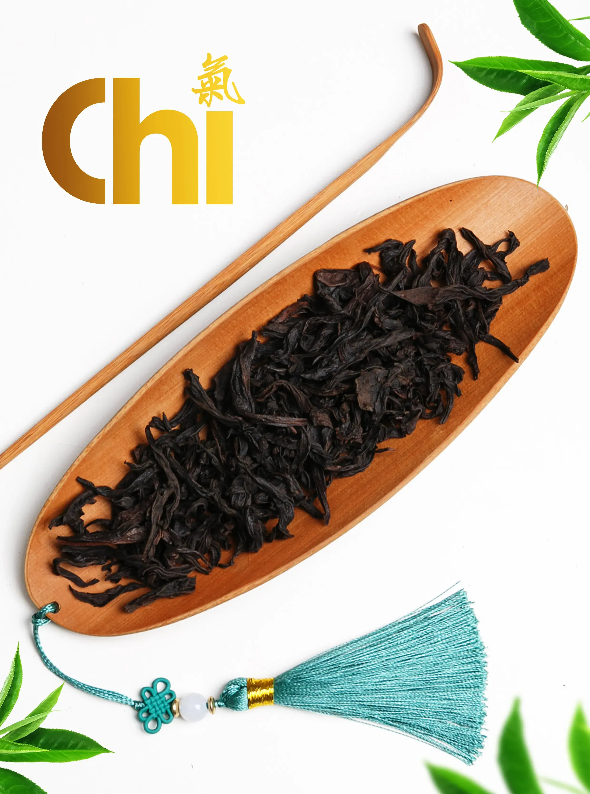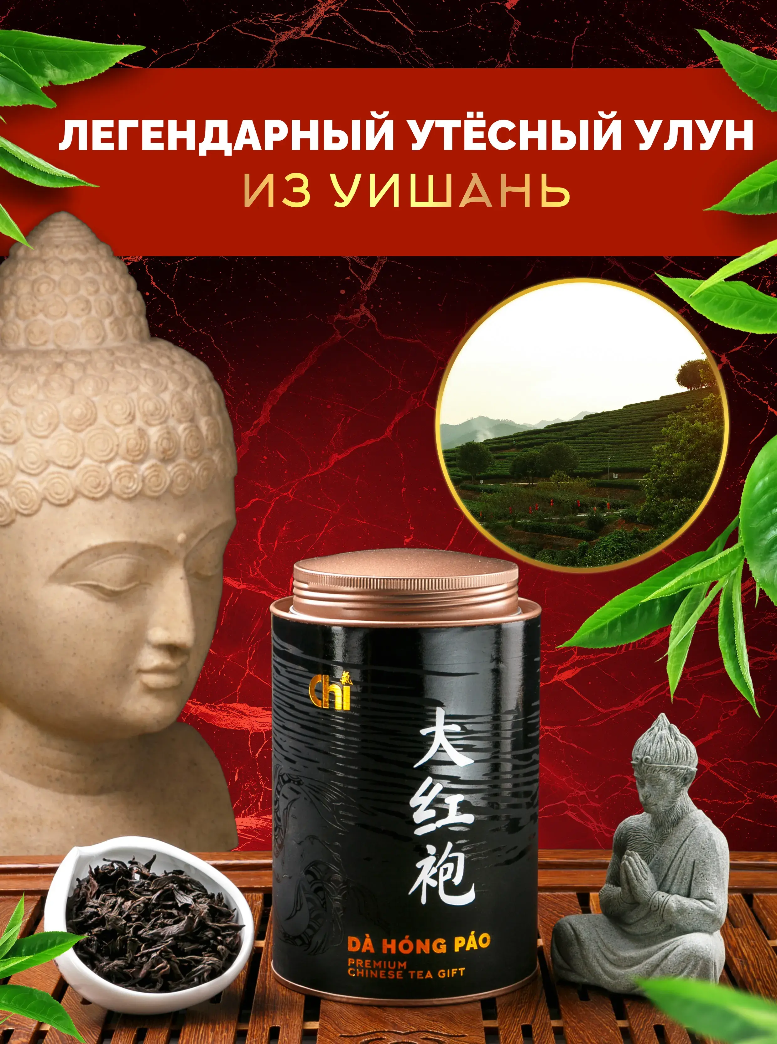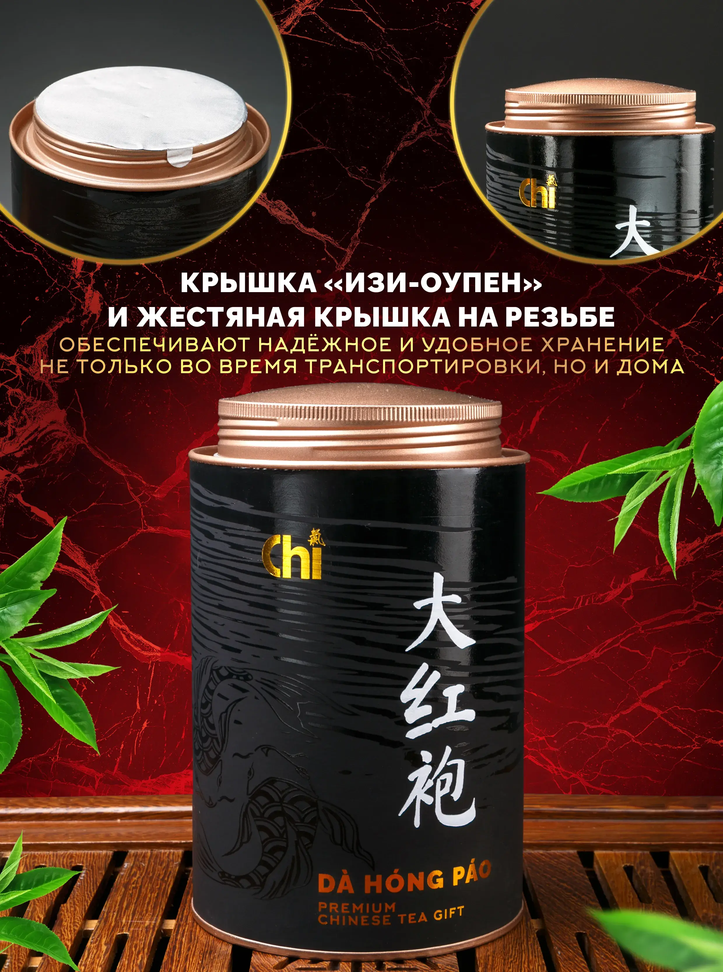 Упаковка: чёрная металлическая банка с золотой крышкой, иероглифами 大红袍 и брендом CHI, деревянная ложка в комплекте