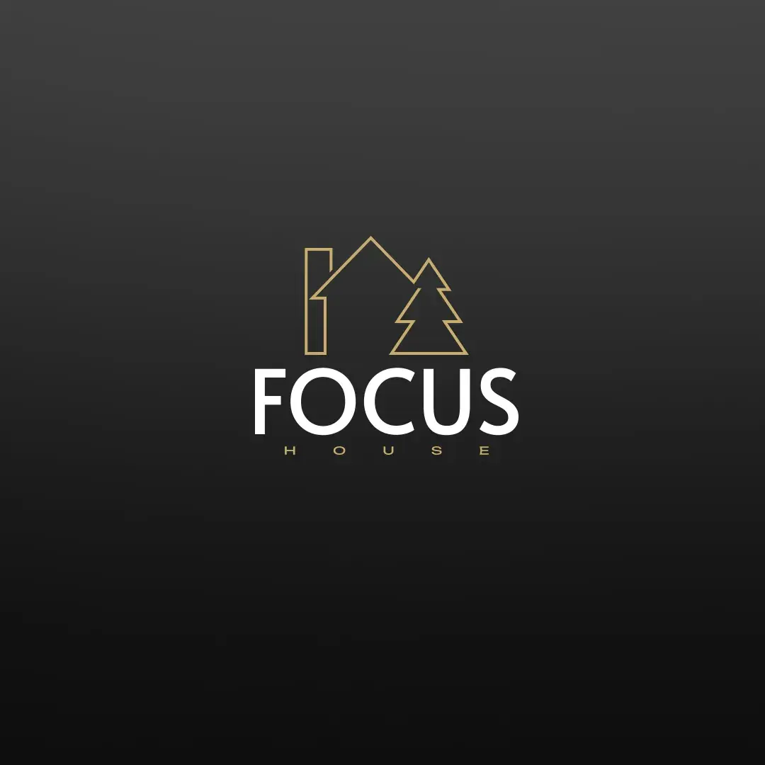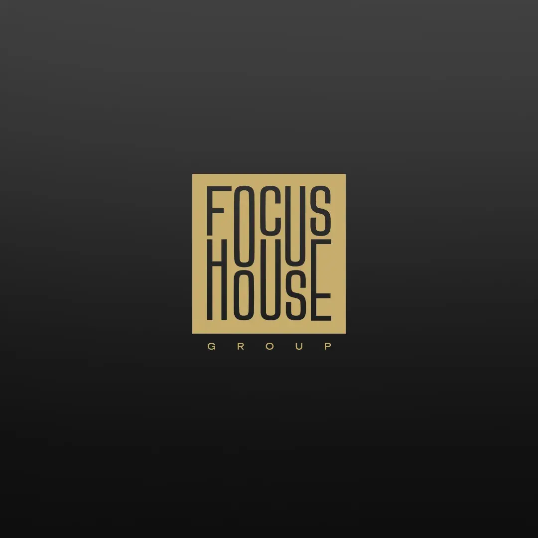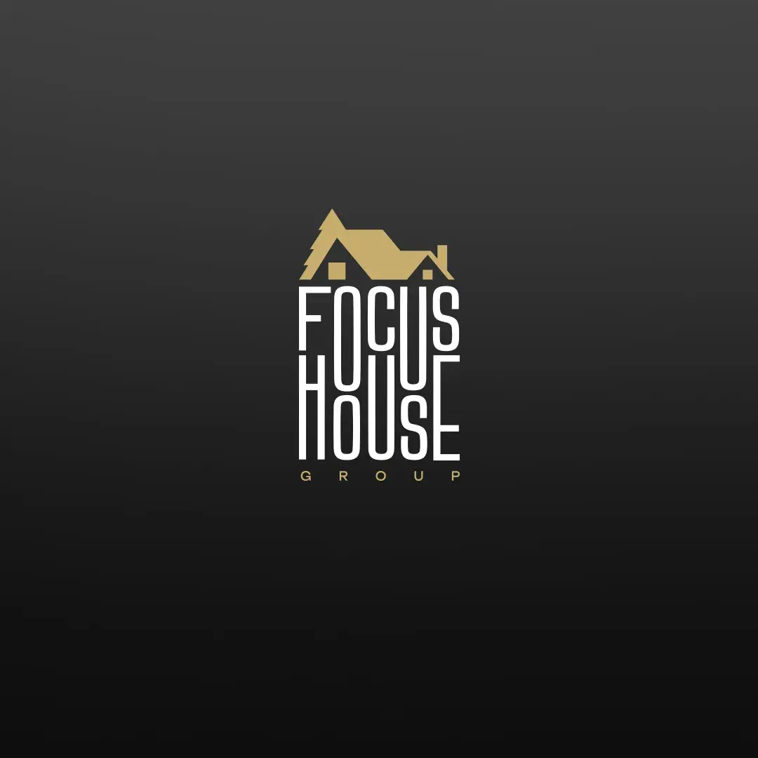 • Надпись «FOCUS» — современный sans-serif с утончённой линией, «HOUSE» — в золоте для тепла