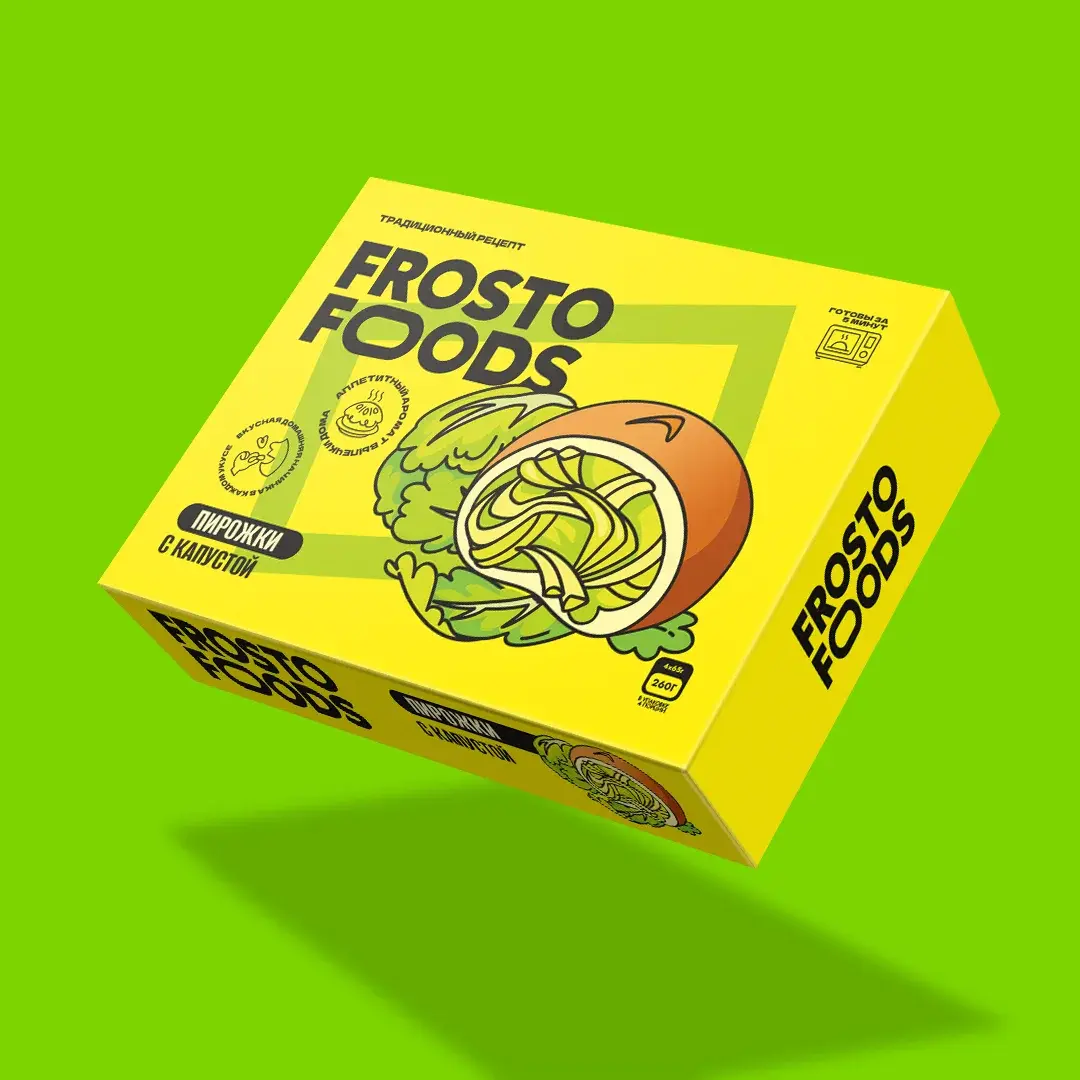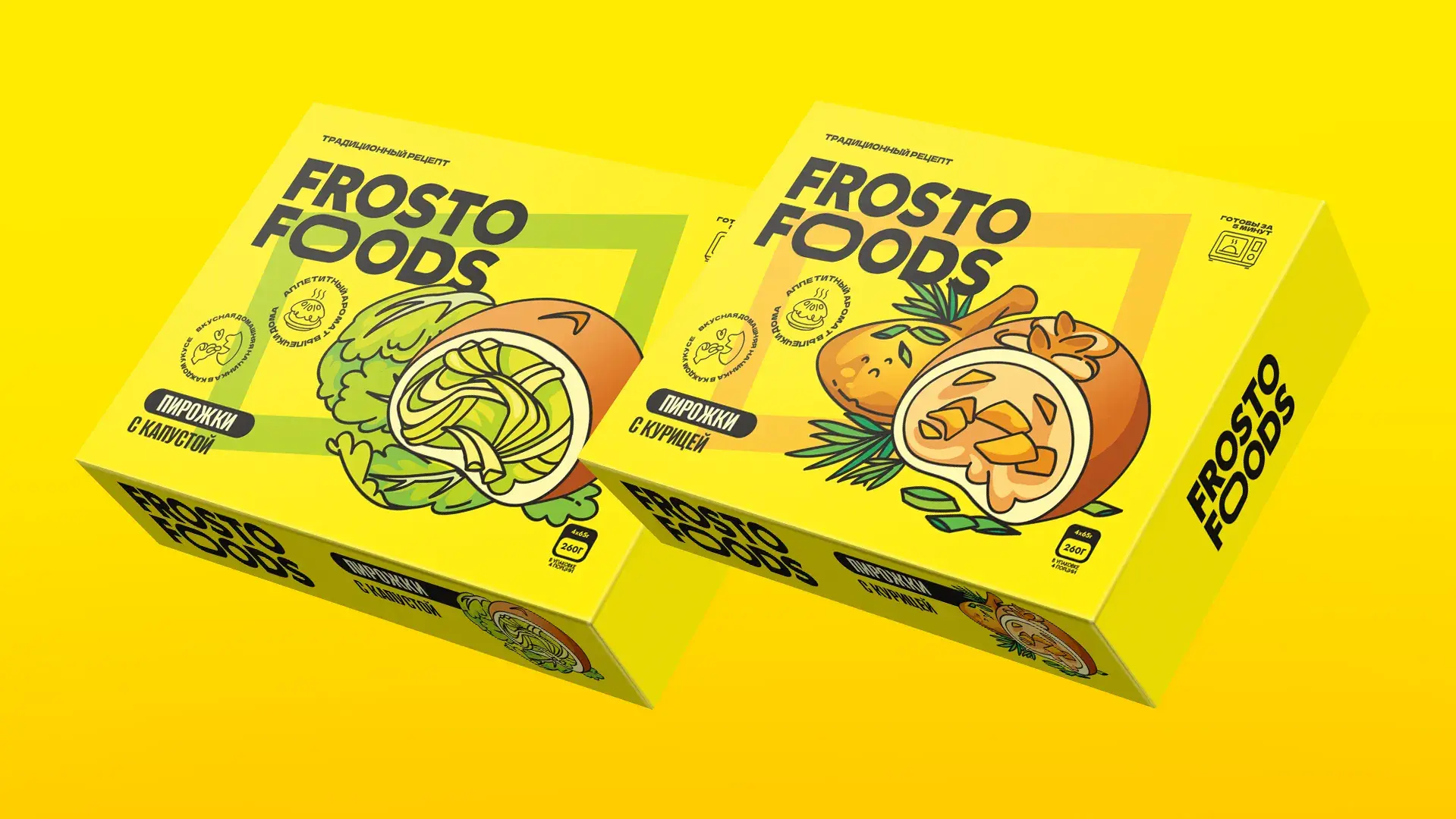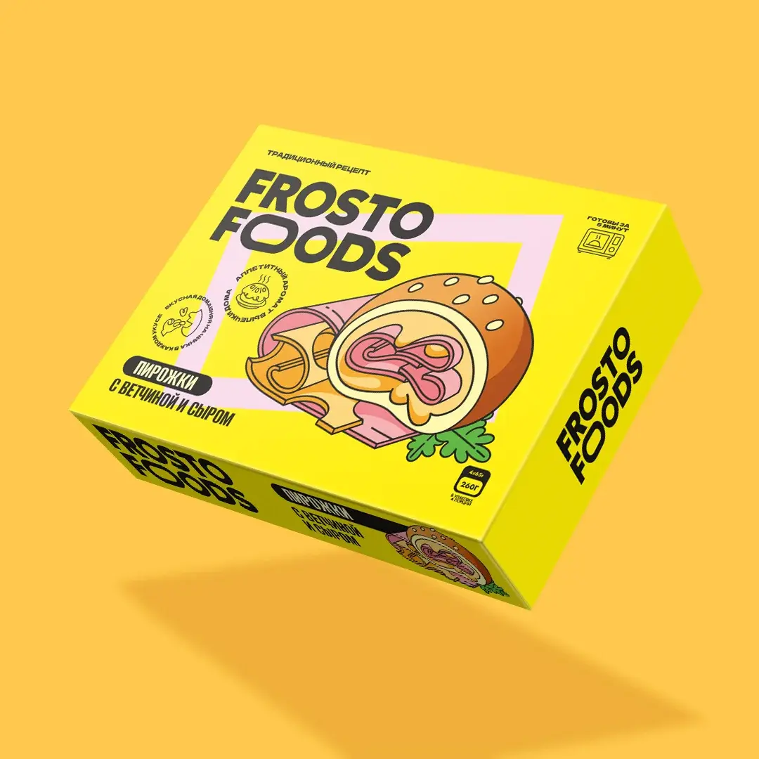 Дизайн упаковки Frosto Foods с ярким жёлтым фоном и мультяшными пирожками привлекает внимание среди конкурентов. Логотип с жирным наклонным шрифтом стал узнаваемым бренд-идентификатором для всей линейки. Иллюстрации начинок вызывают аппетит и ассоциации с домашней выпечкой. Иконки «Готовы за 5 минут» и «Аппетитный аромат» подчёркивают удобство и вкус. Единый стиль обеспечил высокую узнаваемость бренда в супермаркетах и соцсетях. Упаковка адаптирована под замороженный формат: чёткая информация о хранении и приготовлении.