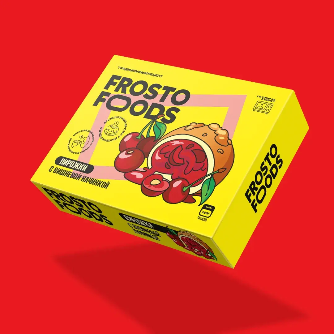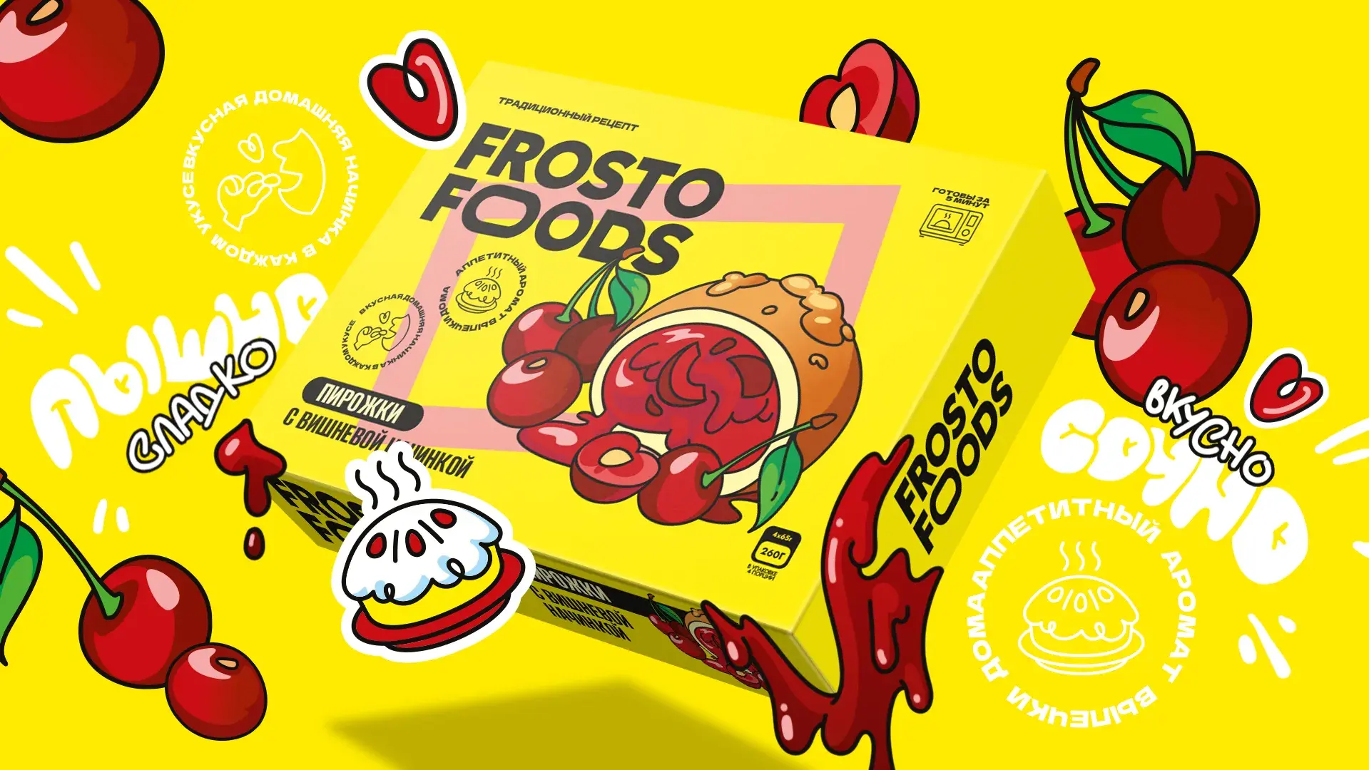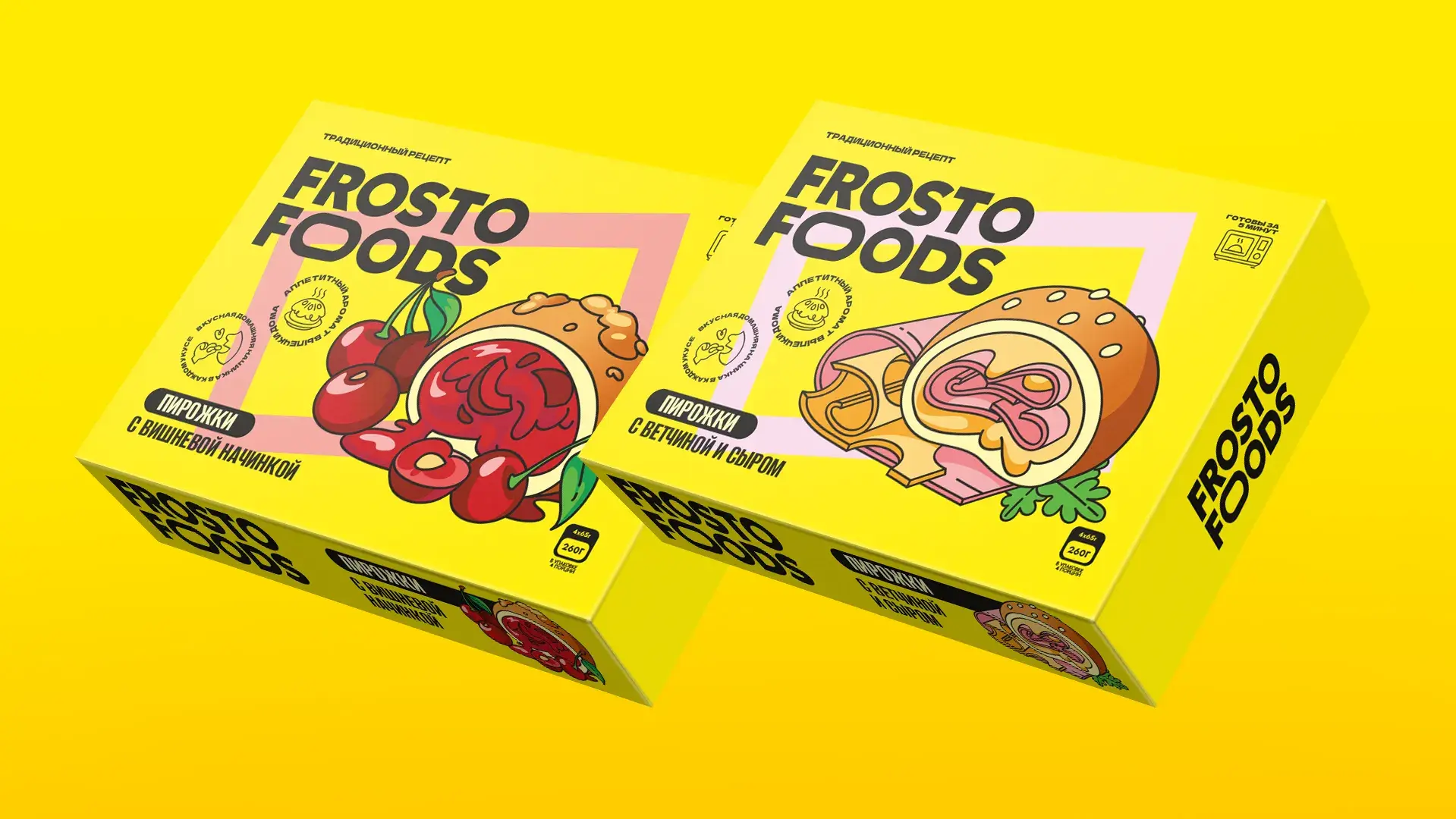 Дизайн упаковки Frosto Foods с ярким жёлтым фоном и мультяшными пирожками привлекает внимание среди конкурентов. Логотип с жирным наклонным шрифтом стал узнаваемым бренд-идентификатором для всей линейки. Иллюстрации начинок вызывают аппетит и ассоциации с домашней выпечкой. Иконки «Готовы за 5 минут» и «Аппетитный аромат» подчёркивают удобство и вкус. Единый стиль обеспечил высокую узнаваемость бренда в супермаркетах и соцсетях. Упаковка адаптирована под замороженный формат: чёткая информация о хранении и приготовлении.