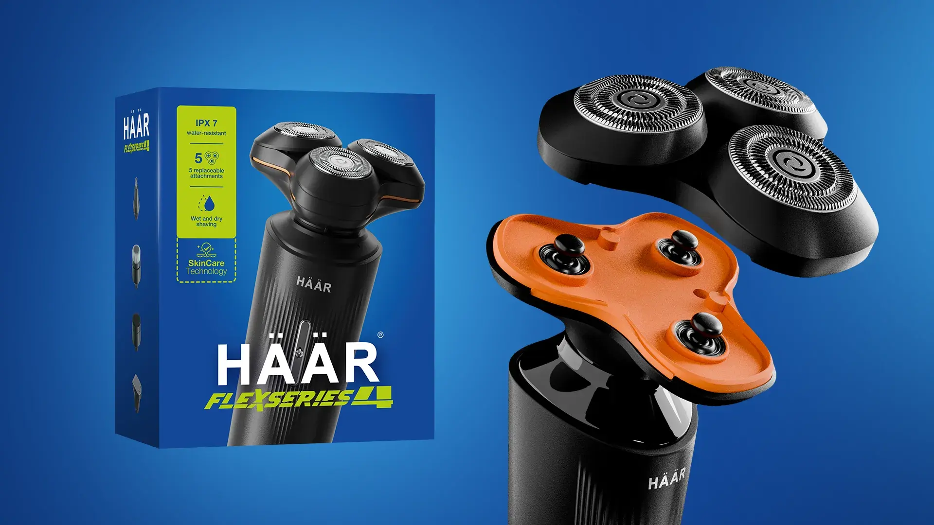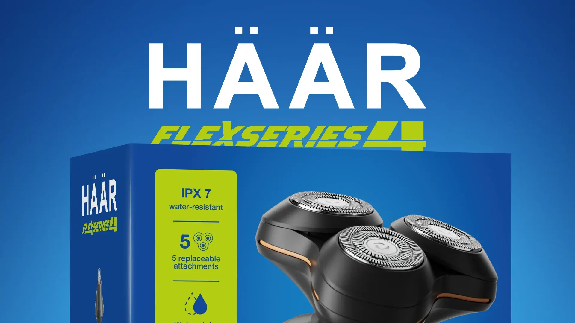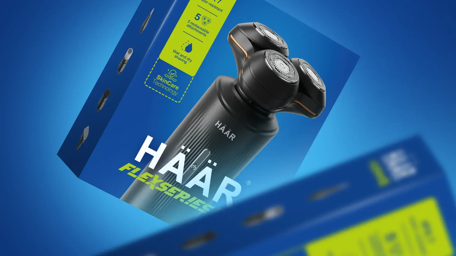 Перед нами стояла задача создать дизайн упаковки для новой модели бритвы HÄÄR Flexseries 4. Необходимо было подчеркнуть технологичность и современность продукта, сделать визуал привлекательным и конкурентоспособным по сравнению с упаковками именитых брендов. Важно было, чтобы коробка выделялась на интернет-витринах и сразу транслировала ключевые преимущества модели.