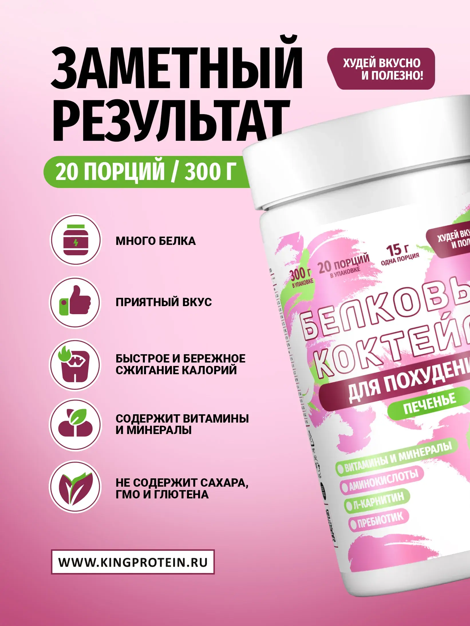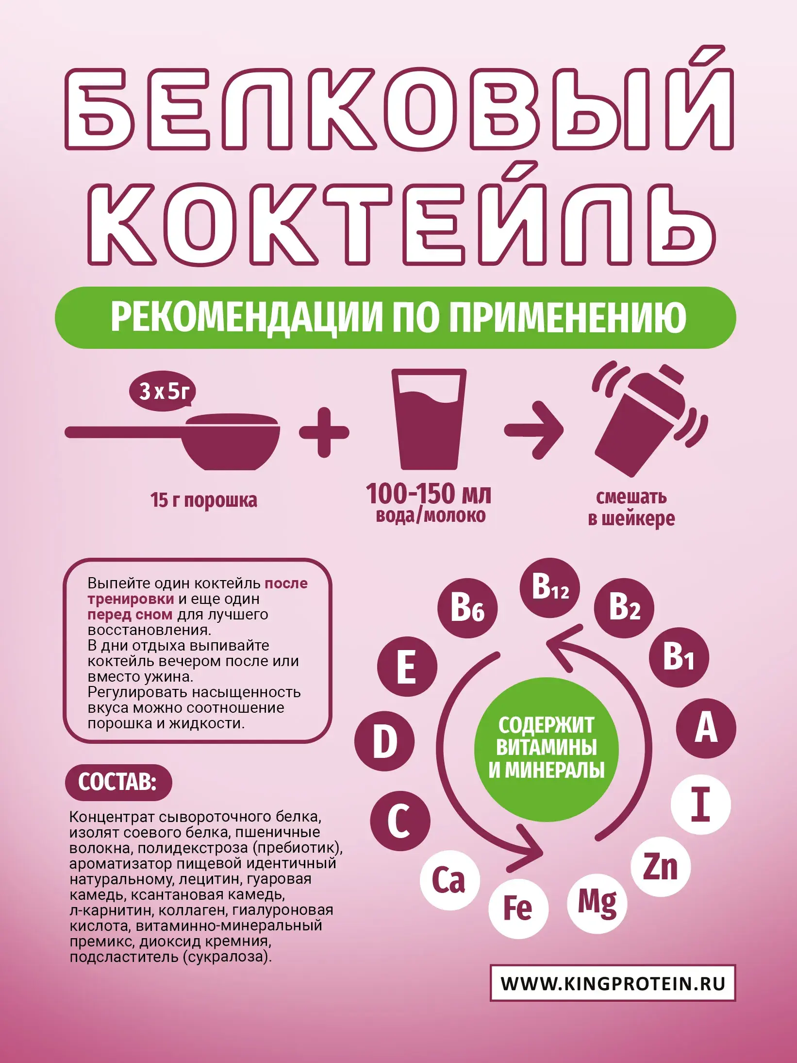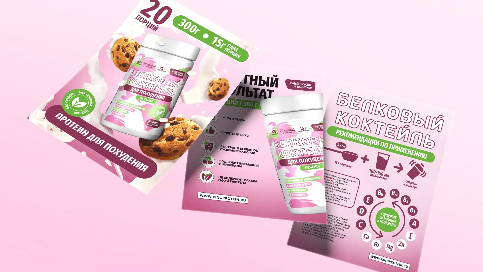 Разработка серии карточек для маркетплейсов King Protein, подчёркивающих вкус, пользу для похудения и удобство приёма протеинового коктейля.