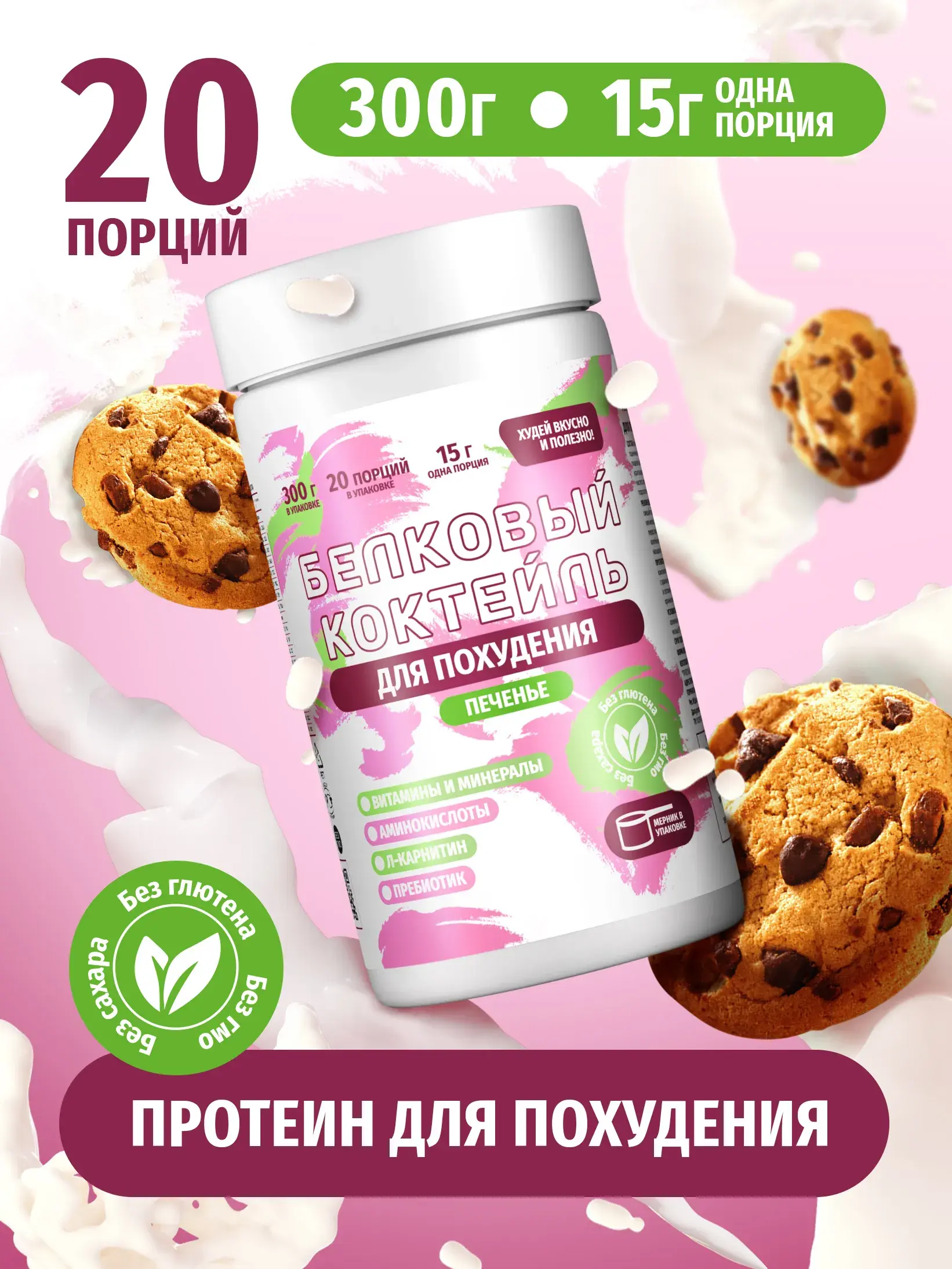 Карточки выполнены в розово-бежевой гамме с фото печенья, молока и банки для ощущения вкусного перекуса. Главная фотография демонстрирует банку с текстом «20 г белка + витамины». Блоки инфографики показывают преимущества: снижение аппетита, поддержка мышц, улучшение обмена веществ, состав (витамины A, B1-B12, C, D, E; минералы Ca, Fe, Mg, Zn, I) и рекомендации по приёму (3 порции в день, 100–150 мл воды/молока). Дополнительно указаны шейкер и количество порций. Формат оптимизирован под маркетплейсы: 1200x1200 px, 4-слайдовая карусель, SEO-теги «протеин для похудения ваниль».