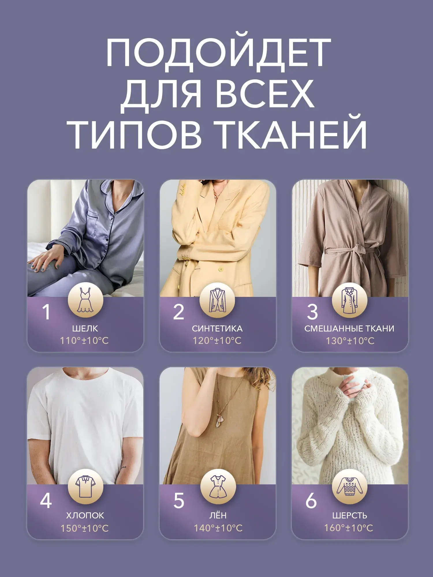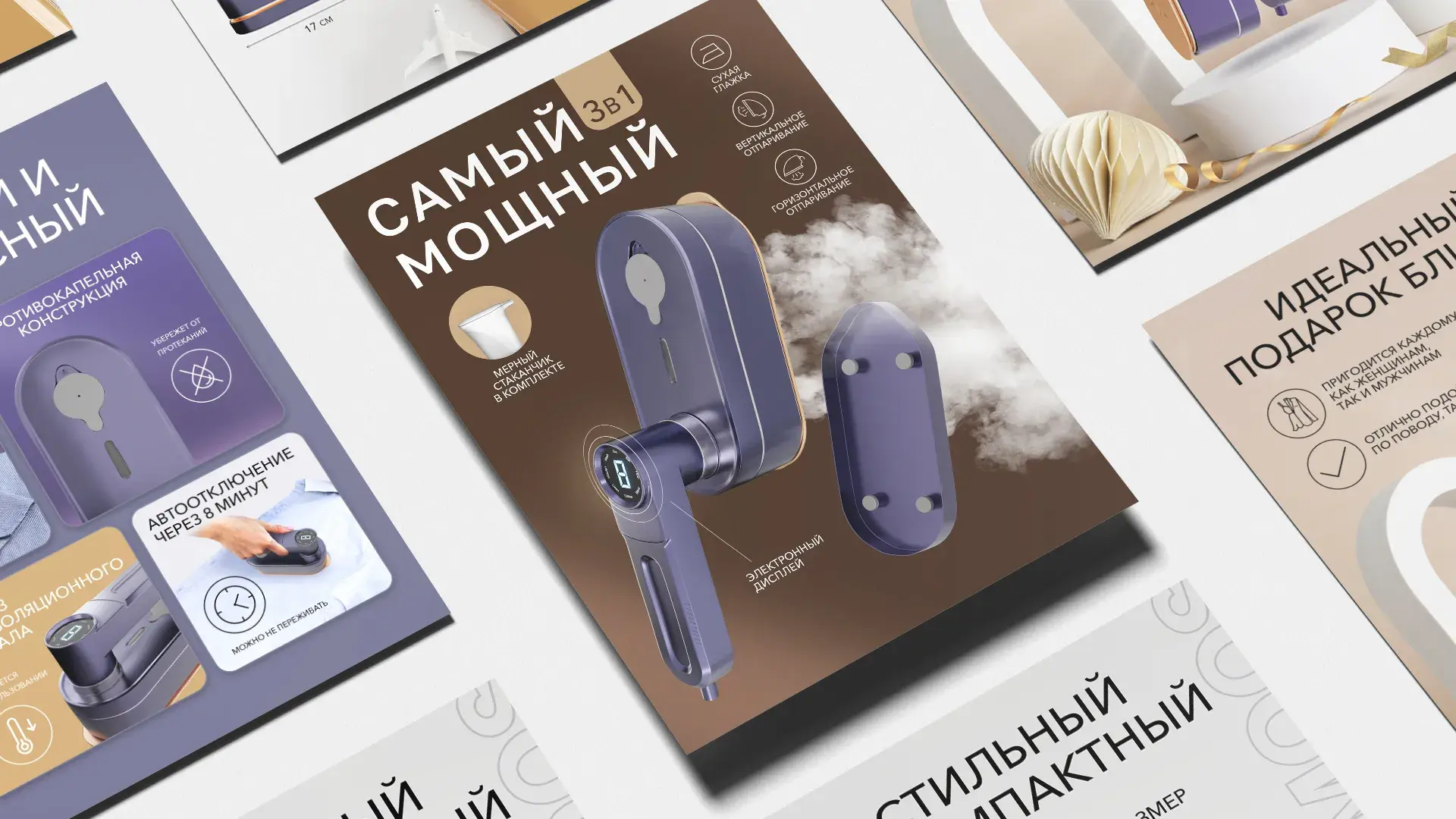 Карточки выполнены в коричнево-фиолетовой гамме с фото устройства, пара и аксессуаров для визуализации работы.
