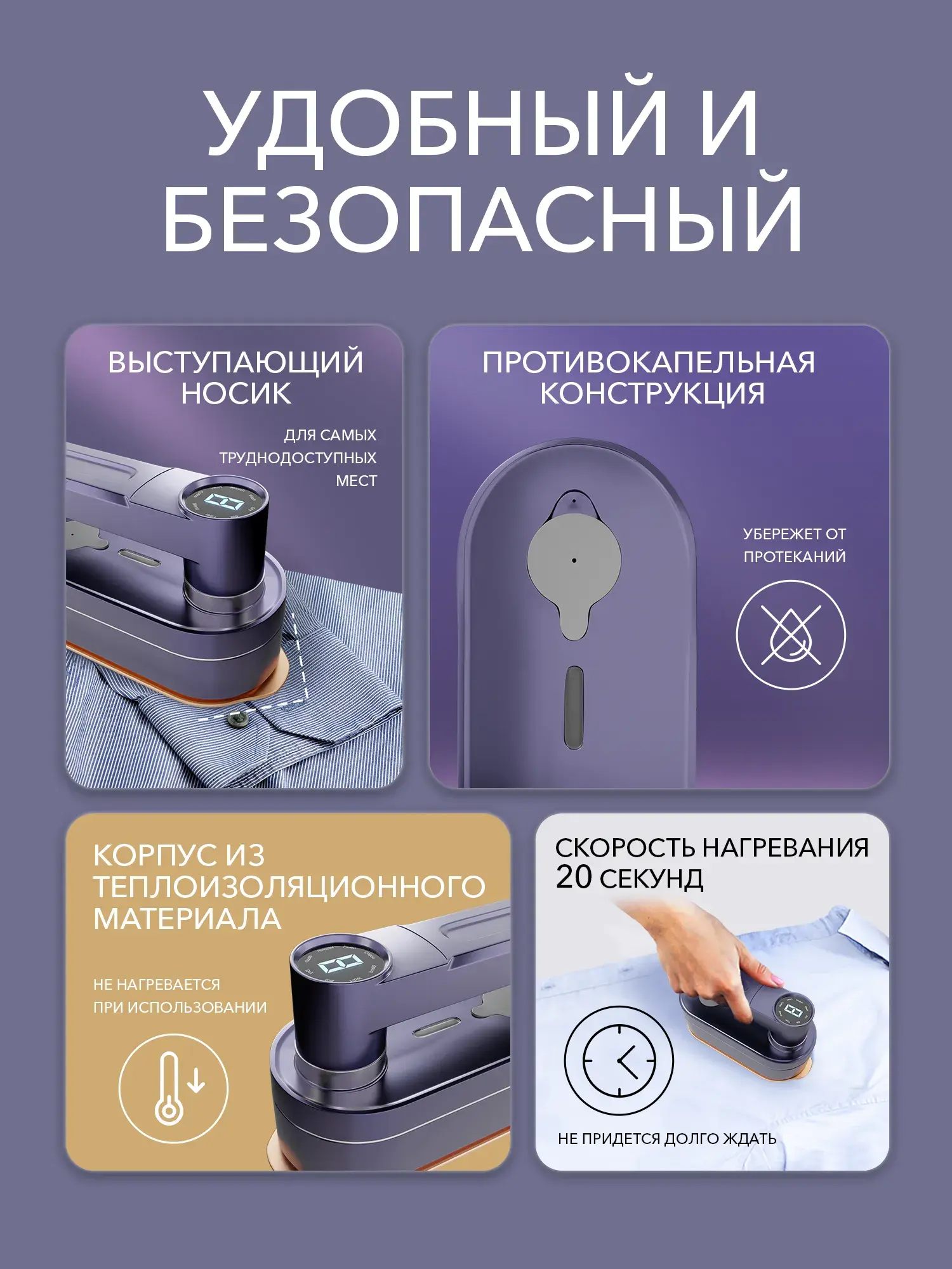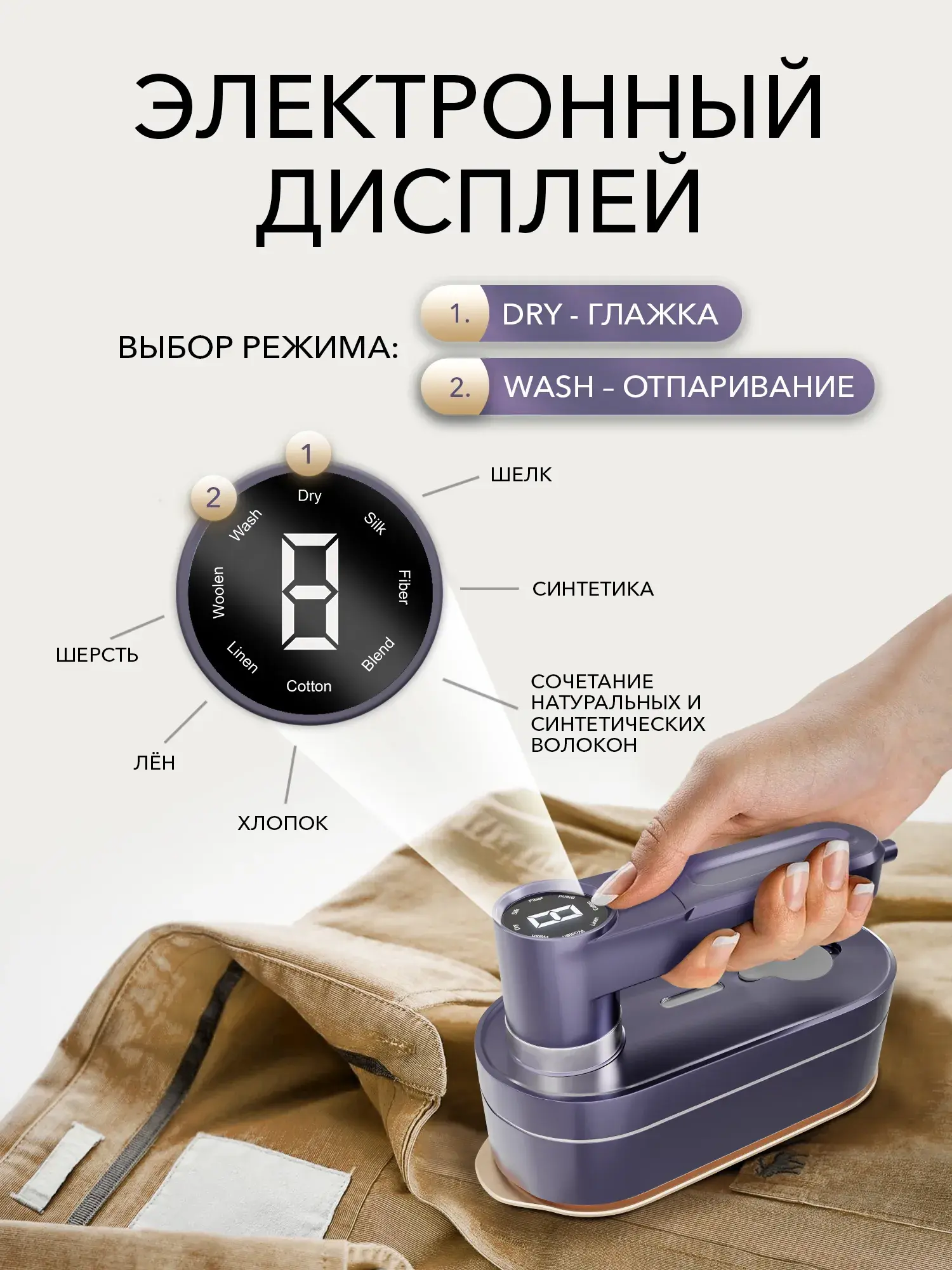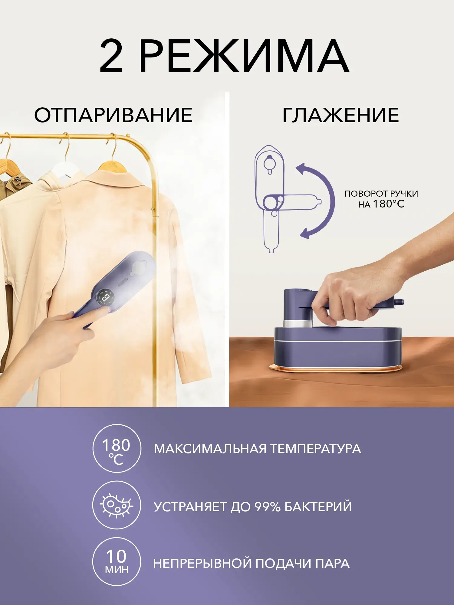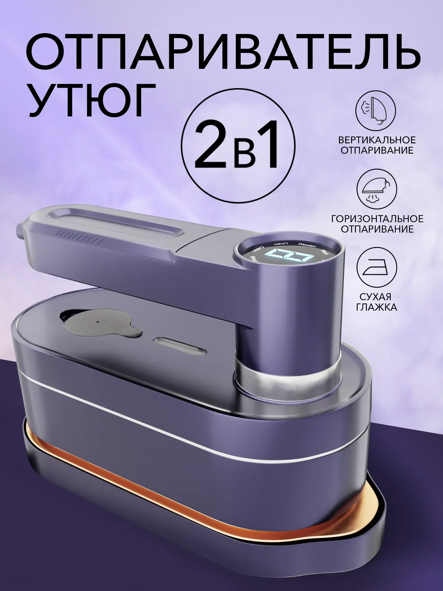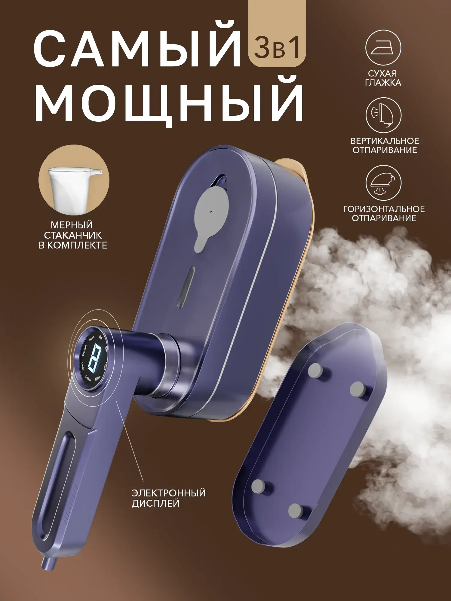 • Главное фото: отпариватель с электронным дисплеем и текст «Самый мощный 3 в 1».