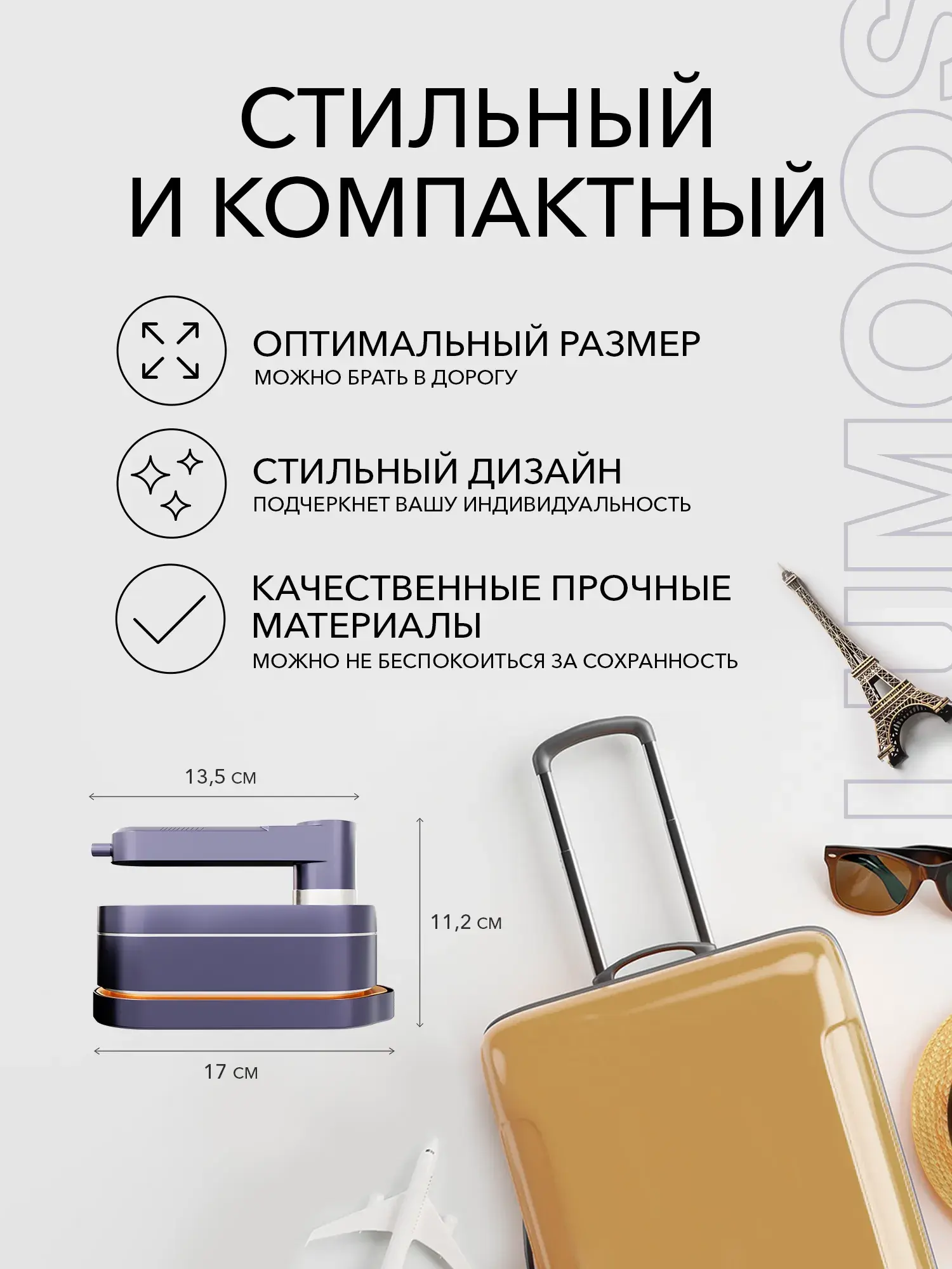 • Формат: 1200x1200 px, карусель из 4–5 слайдов, SEO-теги «отпариватель LUMOOS 3 в 1», «компактный отпариватель».