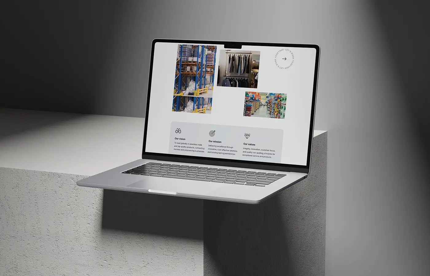 • Блоки: Vision («To lead globally in seamless trade»), Mission («Delivering excellence through innovative solutions»), Values (Integrity, Innovation, Customer Focus, Quality) в карточках