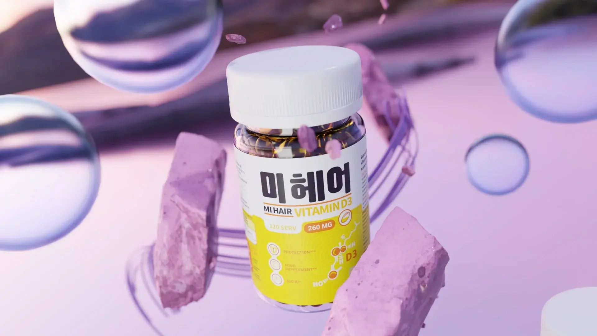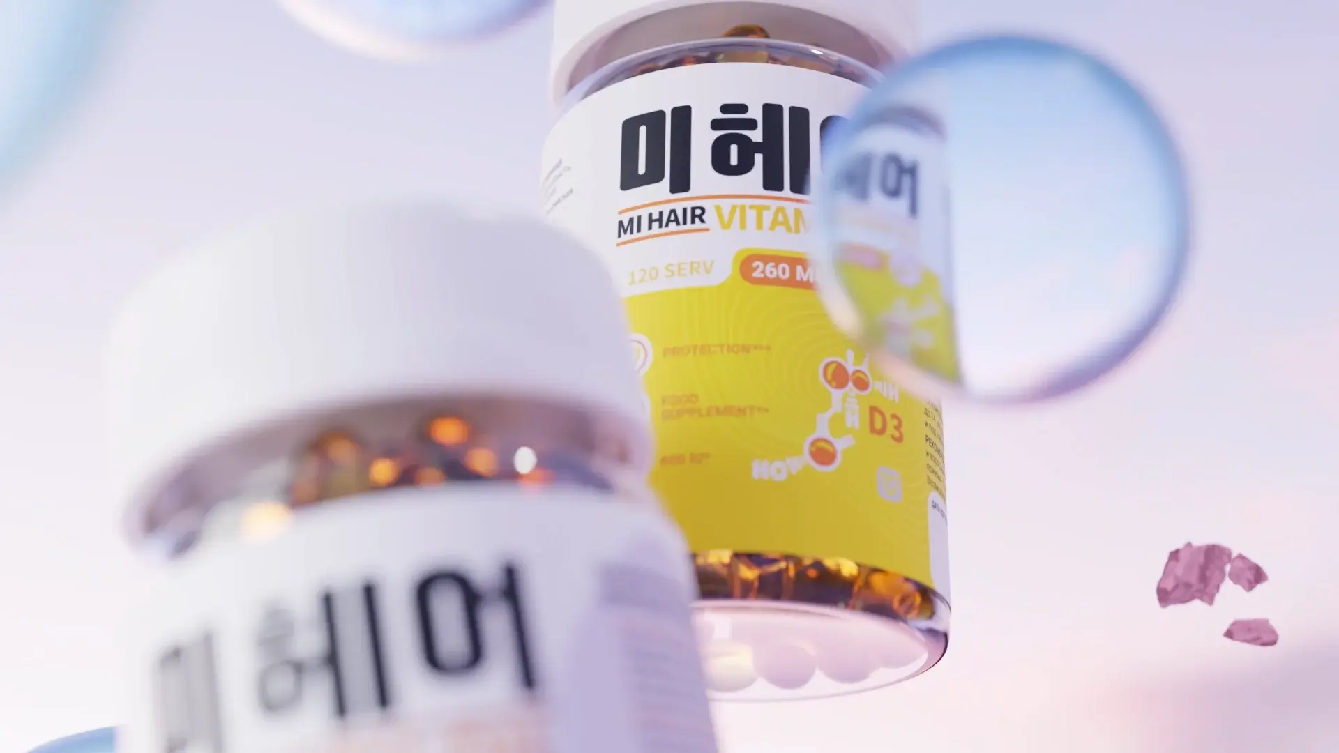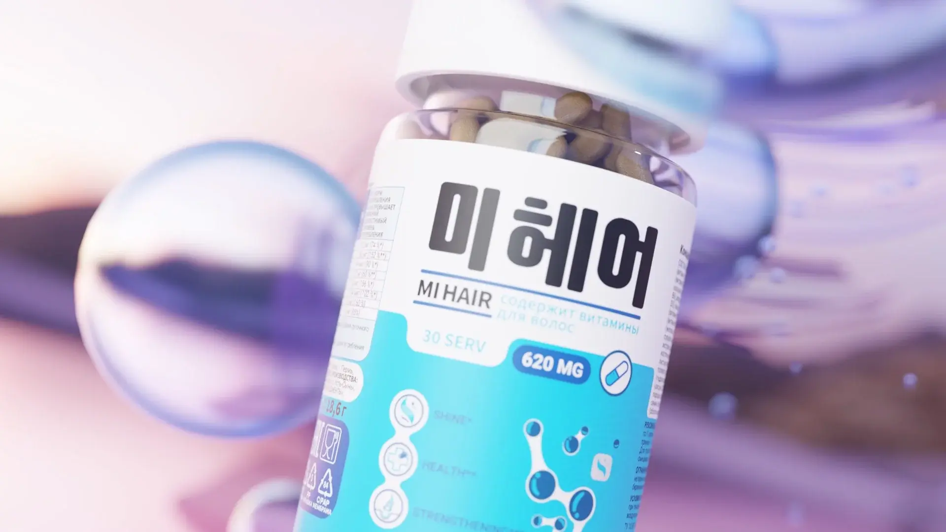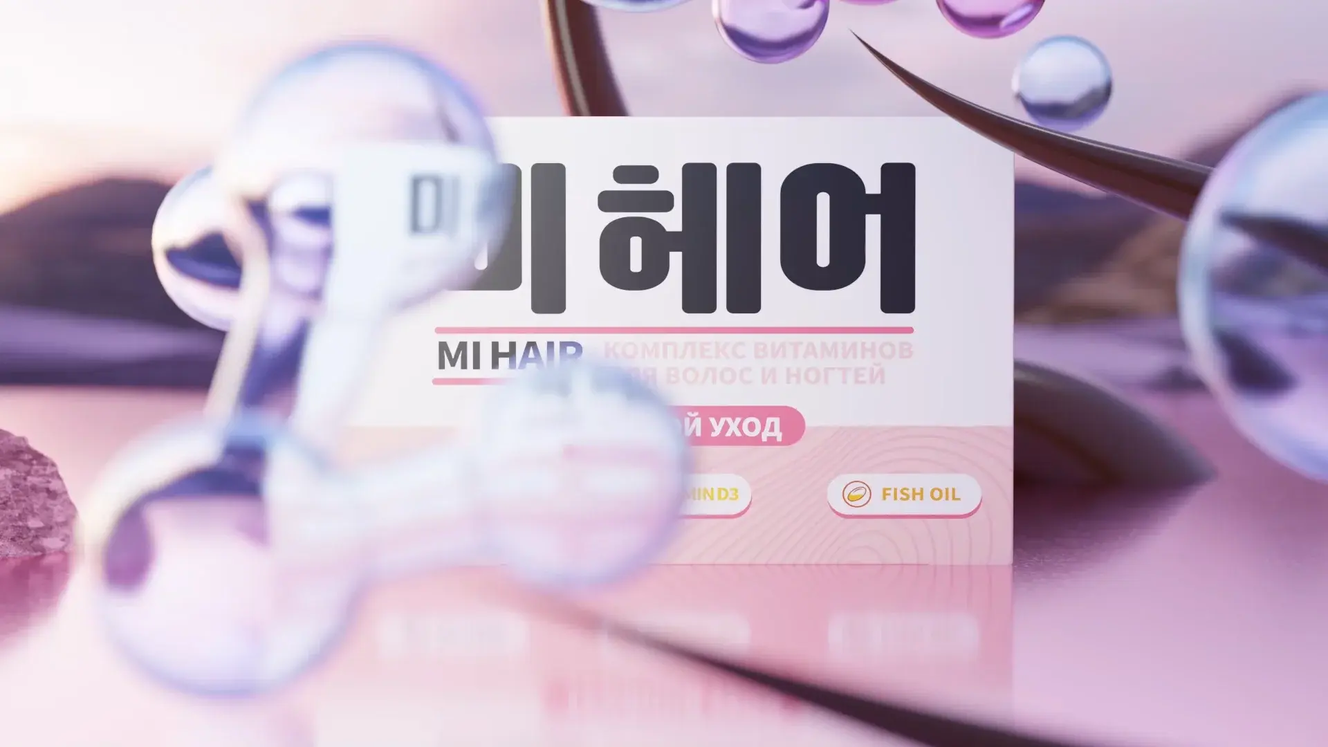 Для продвижения линейки MI HAIR требовалось 3D-видео (15–30 сек), демонстрирующее состав продукта (рыбий жир, биотин, витамины), его действие на волосы и визуальную привлекательность. Нужно было создать иммерсивную анимацию с пузырями, капсулами и молекулярными структурами в пастельных тонах, подходящую для Instagram, TikTok, сайта и рекламы — чтобы подчеркнуть "комплексный уход" и вызвать доверие.