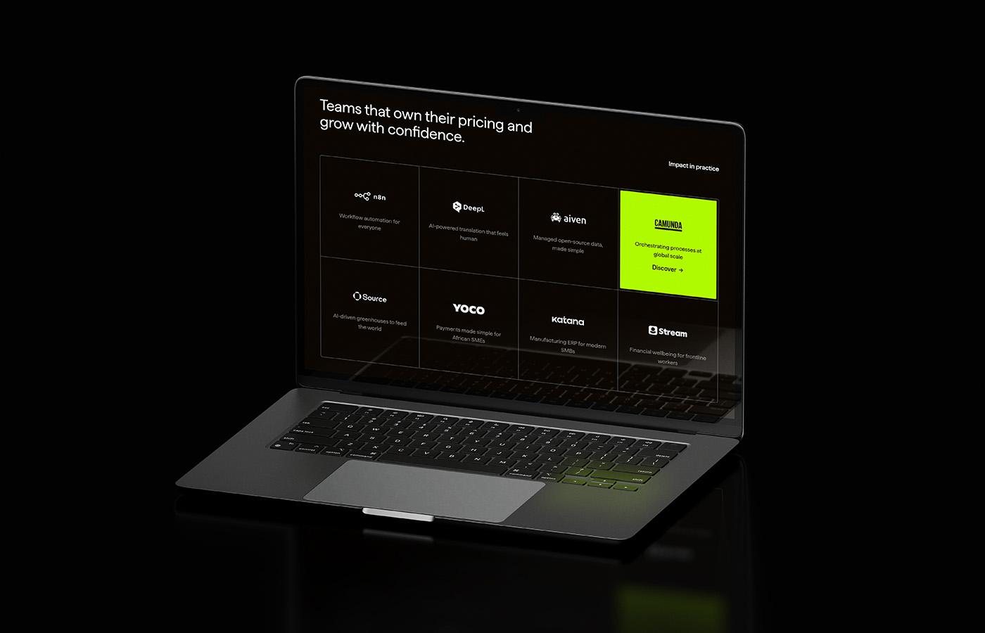 • Главная с заголовком «Own your pricing. Grow with confidence.» и блоками по стадиям (Venture, Growth, Established) с описаниями и CTA «Get in touch»