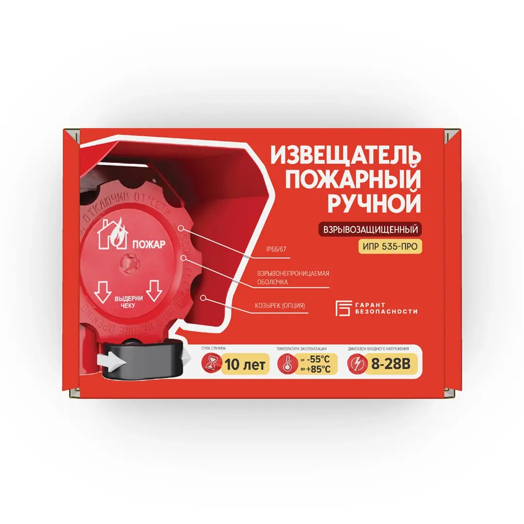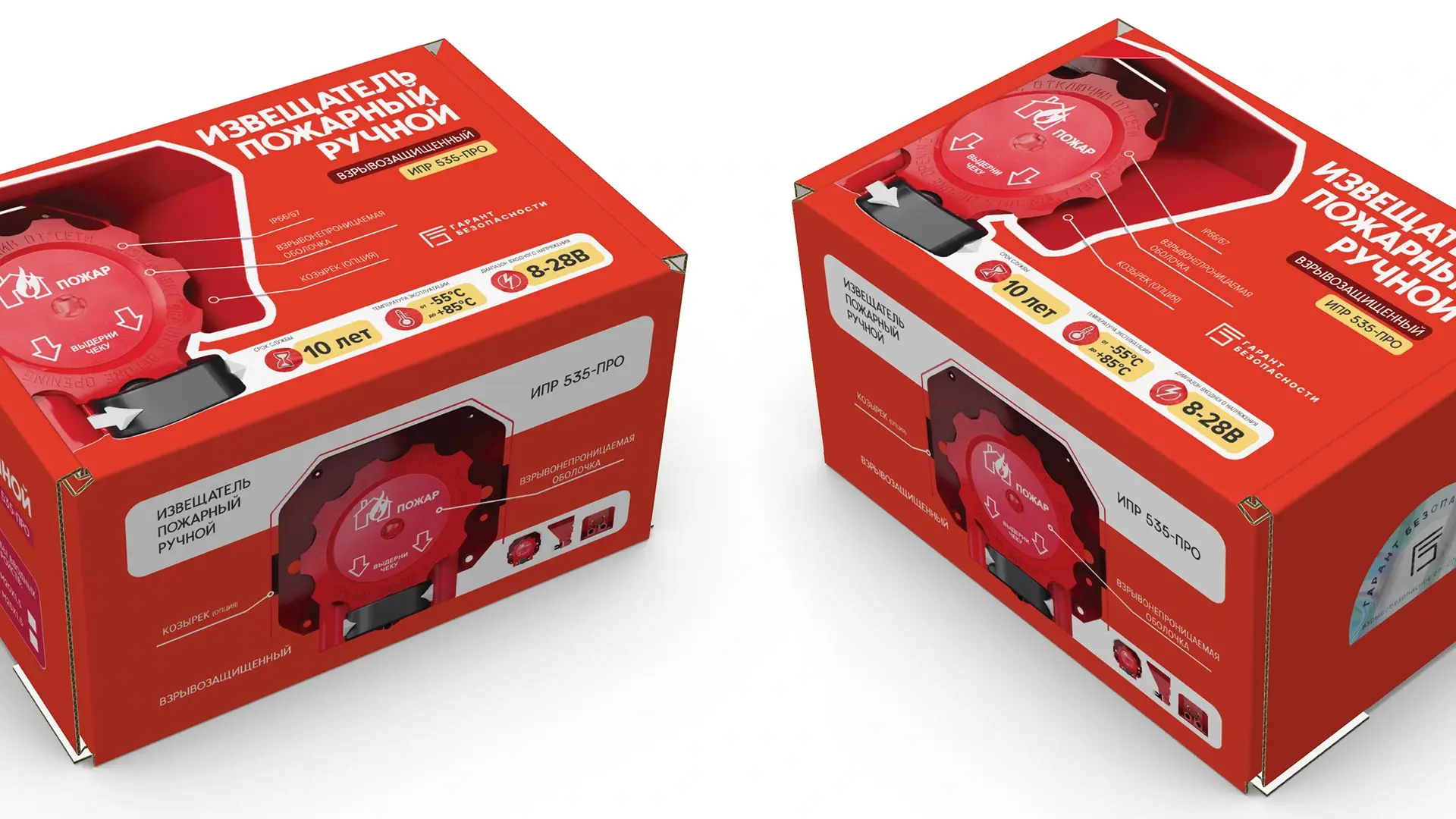 Разработать упаковку для ручного пожарного извещателя, предназначенного для B2B рынка (заводы, склады, промышленные объекты). Упаковка должна отражать профессиональный и технический характер устройства, быть информативной, легко читаемой и подчеркивать надежность и безопасность продукта.